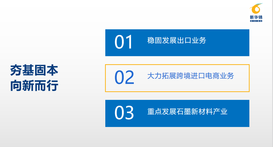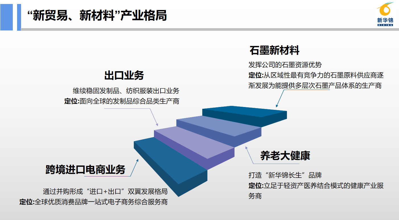 金年会 总部位于山东青岛,是新华锦集团旗下A股上市公司。公司在国际贸易业务领域深耕多年,主营发制品和纺织品服装产品的生产加工及业务出口业务,同时布局了石墨新材料产业和跨境进口电商业务,已逐步形成了“两大核心战略”“四个业务板块”,初步建立了“新贸易、新材料”的产业格局。